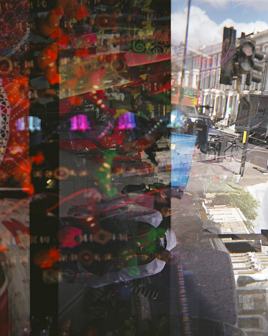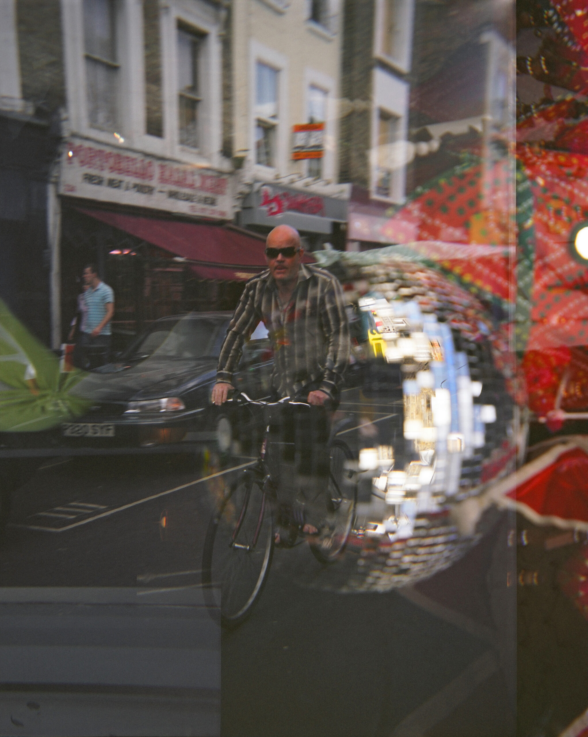 This series of images was taken while visiting the Portabella Road weekend market in London. It was a beautiful, sunny day, and there were many people shopping at the variety of stalls and fascinating shops along the street. I was inspired to capture the fun, invigorating energy of the place and the people there. My Holga film camera allowed me to shoot medium format film and double expose each frame. If you look closely, you can see that almost every frame has a vertical and a horizontal image within it. Notice the man riding his bicycle through the mirror ball at the center of the piece. The mirror ball was inside a shop window. I shot that first and then turned, and shot the biker on top of it. Enjoy finding all there is to see!